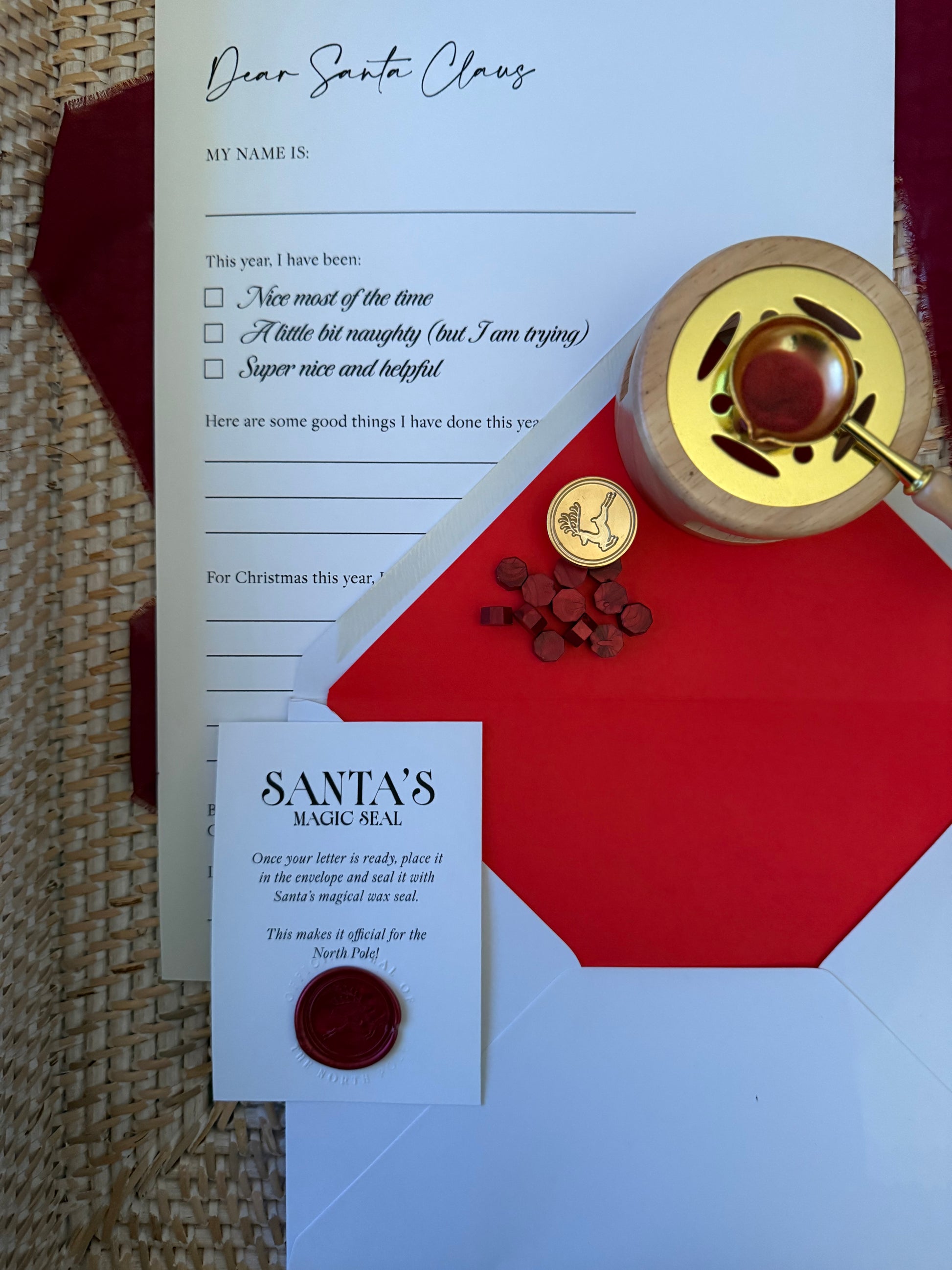 Each kit includes a prompted letter form with gentle, festive questions to help little ones tell Santa if they’ve been naughty or nice, share their Christmas wishes, and write a special message. Once complete, children can slip their letter into the elegant envelope addressed to the North Pole and seal it with the included magical wax seal - making it an official delivery straight to Santa and his elves.