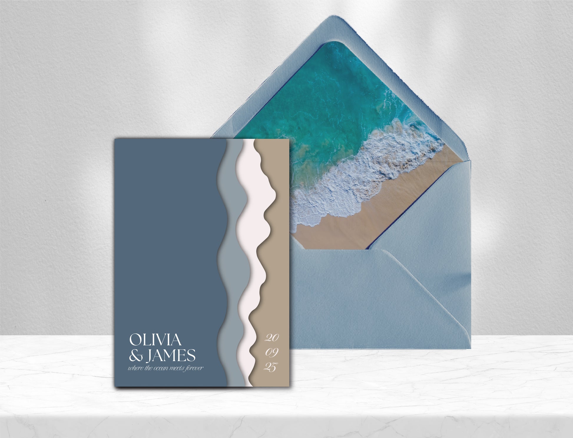 This wedding stationery suite embraces a serene, coastal-inspired design with a soothing blue-toned palette. Each piece features gently “waved” edges, evoking the movement and rhythm of ocean waves, while a beach-themed envelope liner adds a touch of sun-soaked sophistication. The suite is thoughtfully designed to balance visual interest with clean, airy layouts. Typography pairs elegant serif fonts with understated sans-serif accents, creating a look that is both timeless and relaxed. The overall aesthetic is cohesive and breezy, perfect for couples seeking a modern, chic celebration with a subtle nod to the seaside.