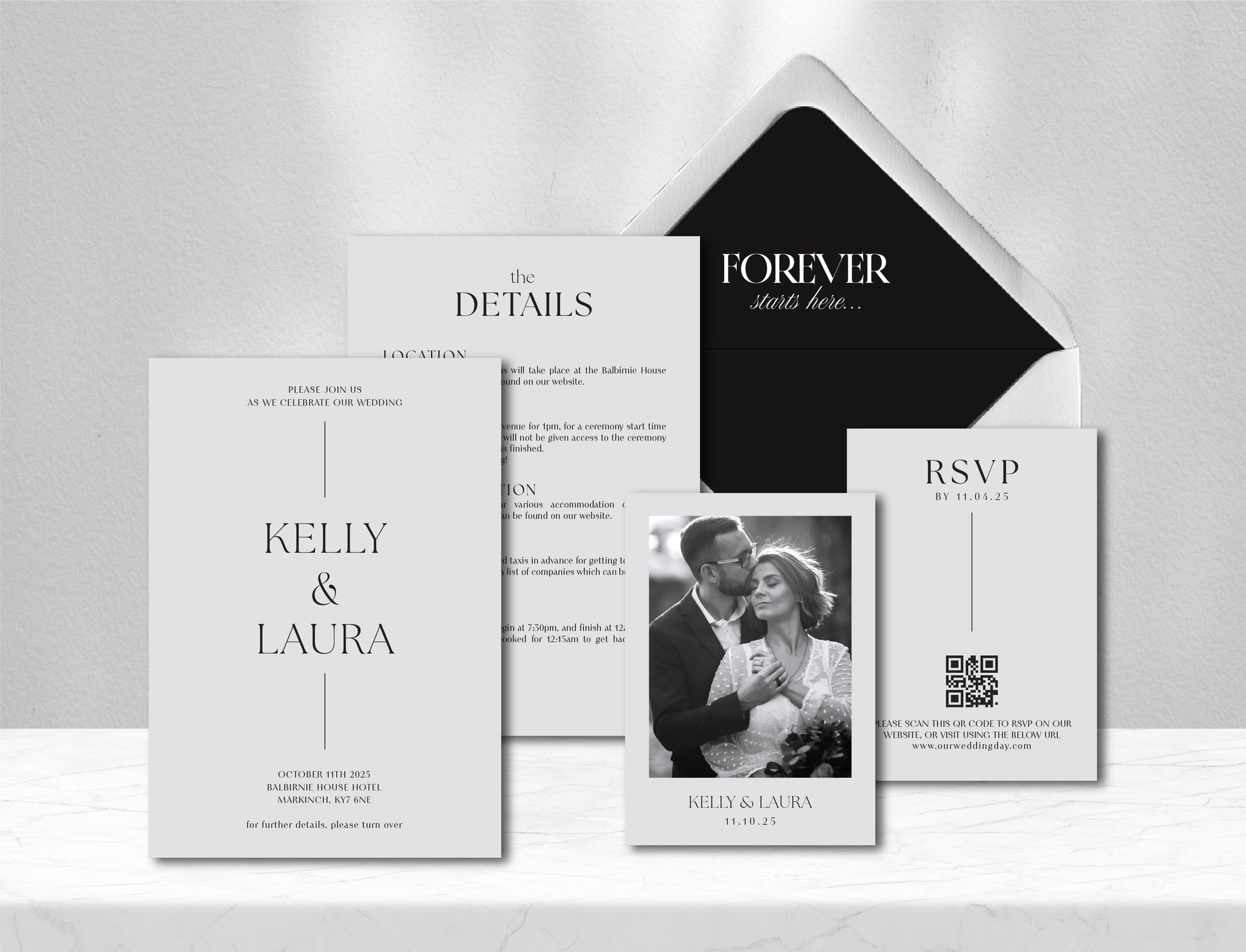 This wedding stationery suite features a sleek, modern, and minimalist design with a monochromatic palette. Clean lines and ample white space create a refined, elegant aesthetic, while the contrasting black envelope liner adds a bold, sophisticated touch. The suite includes a main invitation, RSVP card, details insert, and a photo card, each balancing simplicity with thoughtful layout. Typography is a mix of classic serif and understated sans-serif fonts, giving the suite a timeless yet contemporary feel. The overall look is cohesive and stylish, perfect for couples seeking a modern, chic presentation for their wedding.